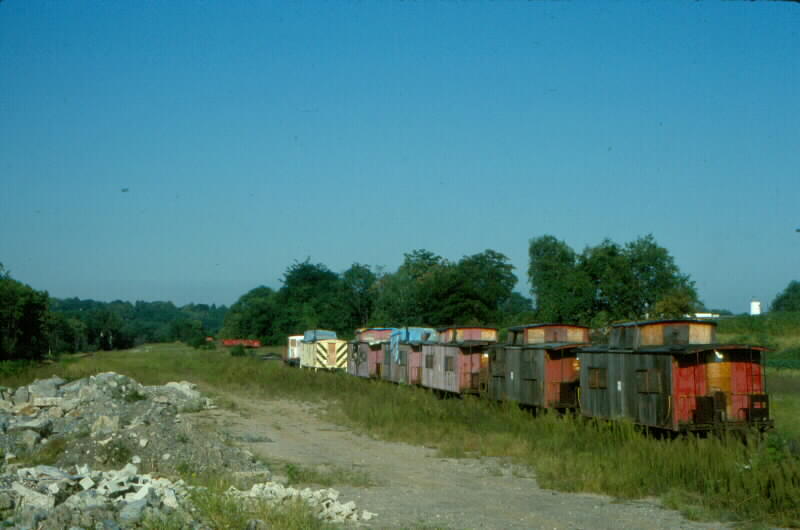 PHOTO #019: Five Lehigh & Hudson River cabooses and the flanger sit in Merritt's Brickyard.