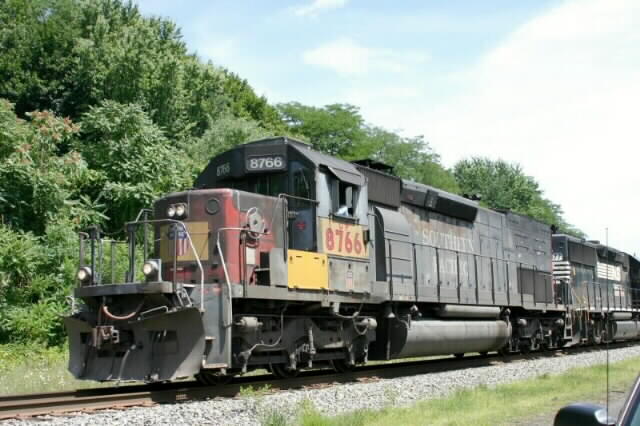 UP 8766 in Southern Pacific bloody nose paint rolls westbound during the PRRH work party Saturday.