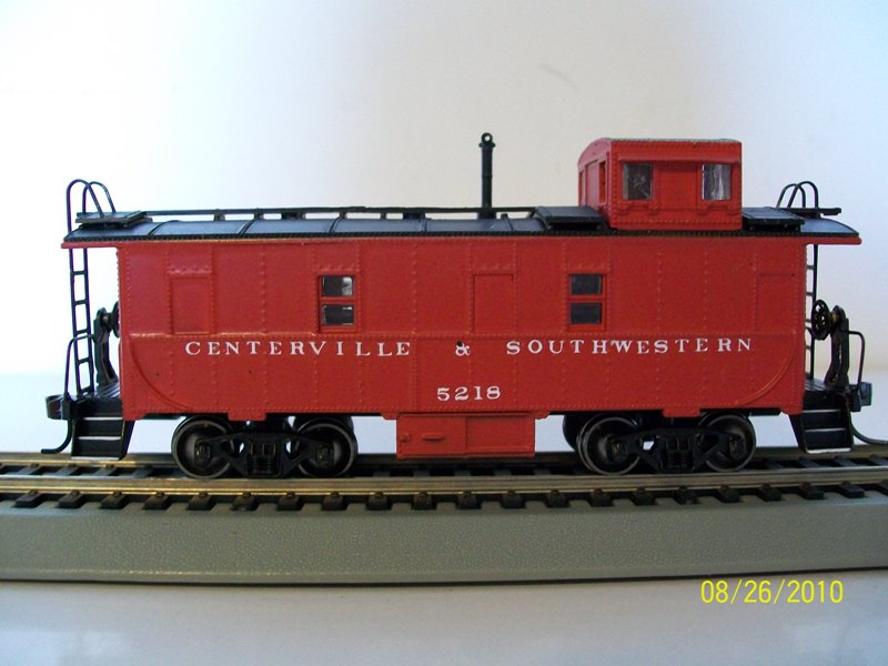 The Centerville & Southwestern red HO caboose. This car is an Athearn R-T-R car and comes equipped with knuckle couplers. The car is painted red.