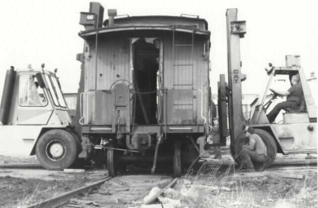 Photo #1 : L&HR caboose #17 being lifted off the tracks at Ingersoll. The two forklift operators did a fantastic job loading these cabooses. There were 6 cabooses moved, numbers: 11, 12, 15, 16, 17 & 18. We kept caboose #16 because it was Norm Coles father's caboose & #18 because it was in the best condition of the 6.