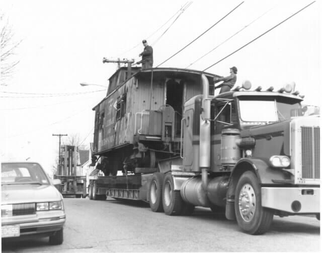 Photo #5 : The caboose is being trucked down Center Street with fork lifts following. The men riding on the caboose are raising the low hanging power, phone and cable wires up and over the cupola.