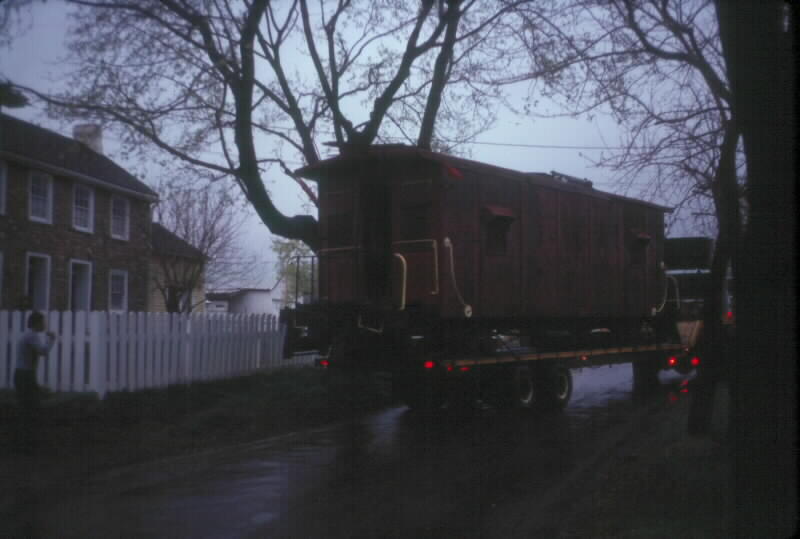 Photo #15: CNJ caboose #91197 has arrived at its new home. Here the truck is seen backing into Pete's driveway. The cupola has been removed to clear low branches and wires.