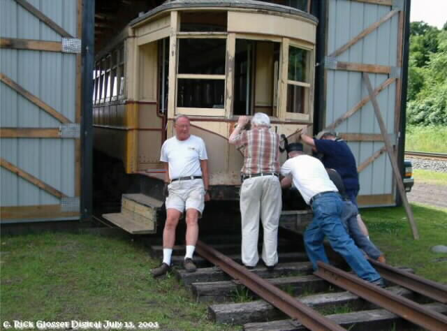 ![]() At the end of the day, the unpowered trolley needs to be pushed back into the enginehouse. Plans are to acquire a set of power trucks and have the trolley fully operational. |
