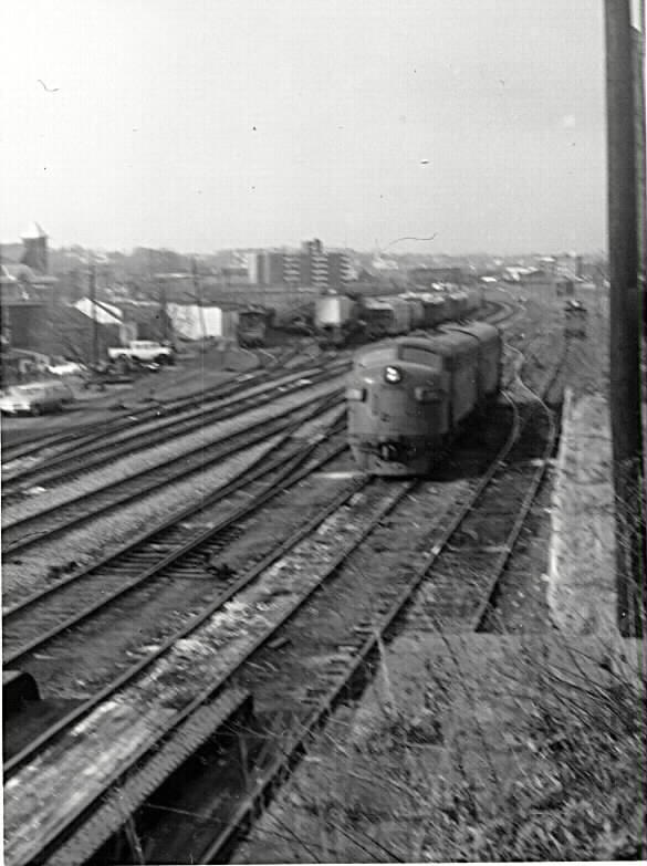 A pair of F7s (one of which may be #11) in the CNJ yard in Phillipsburg. This photo is taken looking west standing on the bridge over Stockton Street. Just look at all that activity.