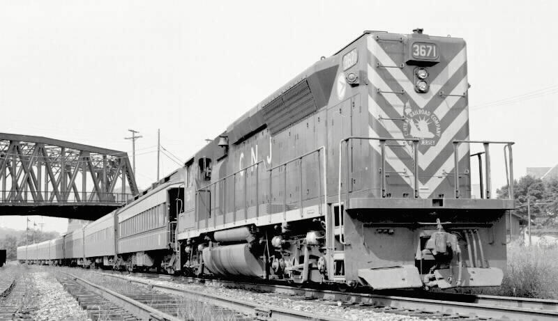 Photo #008: GP40PH #3671 at the head of an eastbound commuter train at Phillipsburg. The Black Bridge is in the background with PU tower to the right and in front of it. Just behind it is the former Union Station that was the joint passenger station with the DL&W.