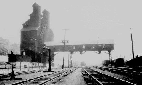Photo #061: Small b&w print of huge CNJ coaling tower over the mains in Phillipsburg. Photo is looking East