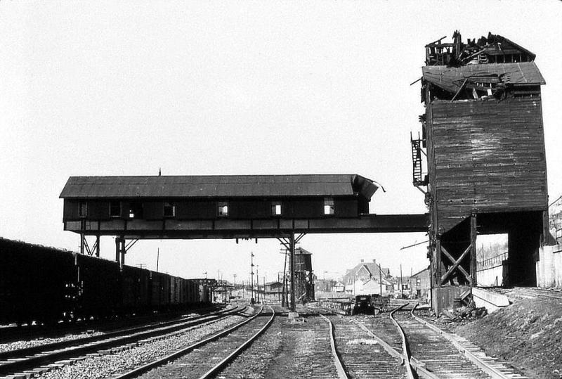 Photo #062: Coaling tower in process of being demolished in 1952. To the right of water tower in background is Sitgreaves school on the corner of Hudson and Brainards streets. Between PU tower and water tank is DL&W freight station on Main street. Blacksmith shop is right of the school just behind the coaling station. Truck is exiting the abandon ash pit, where tracks have been removed.