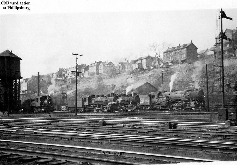Photo #064: CNJ yard looking Northwest. Blacksmith building is behind the steam engines. How about that view if you lived up on Washington street. Roundhouse and machine shop are gone; the three engines on the right are located at the site of the smaller of the two original roundhouses that occupied this area.