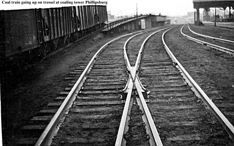 Photo #066: Looking west as a local pushes 3 hoppers up ramp to concrete coal bunkers on Pine Alley. The coal is dumped into the bunkers from the top, then trucks back under the bunkers on Pine Alley and they are then loaded with coal. Bunkers were constructed in 1911 and remain as of 2011 (one hundred years later). Near the top of this incline was a chute that transferred coal from hopper to hopper via another track that was behind this incline out of view. Remnants of this chute also remain as of 2011. On the right coal tipples extend over CNJ main line. Our enginehouse is located approximatly where this switch is.
