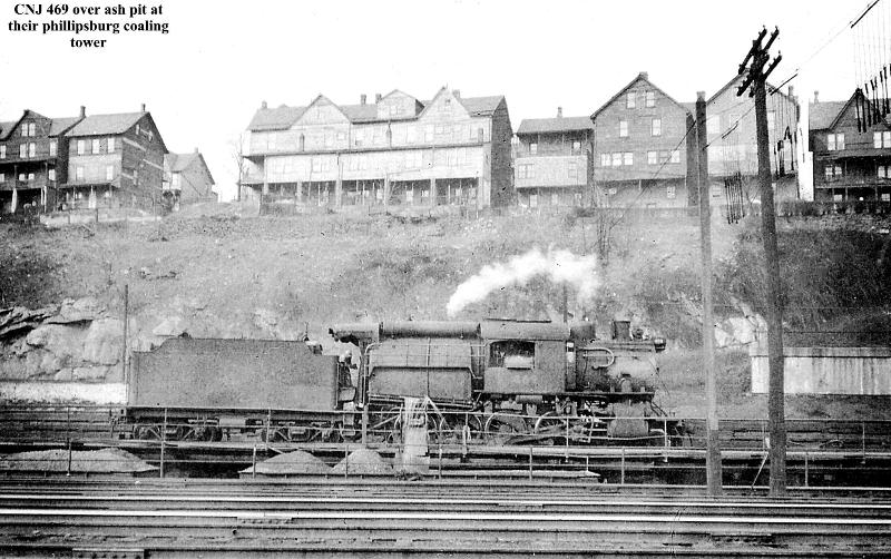 Photo #067: CNJ camelback #469 on ash pit track just west of coaling station. Hoppers in ash pit are being filled directly from the engine. Concrete wall on right is part of the coaling complex. Note the overhead clearance warning devices hanging from the cables on right. To left of the tender is a stone retaining wall for DL&W that ran directly in front of the rock cliff.
