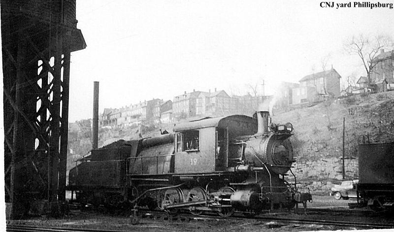 Photo #068: CNJ camelback #19 pauses by the water tower in the CNJ yard. View is looking north with Washington Street on the hill. Stack behind the tender is the boiler house.