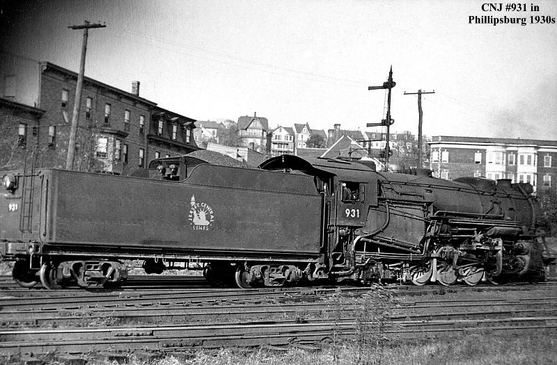 Photo #070: CNJ #931 heads east at the junction of the DL&W in the background. The passenger station is just out of view on the right. The track in the foreground crosses the LV and runs through Mount Pernasis to the PRR Kent Yard. Buildings behind #931's tender are on Stryker Street. Peak of the roof directly behind engine cab is Sitgreaves School. Multi story building behind the engine smoke stack is at the corner of South Main & Hudson Stree.