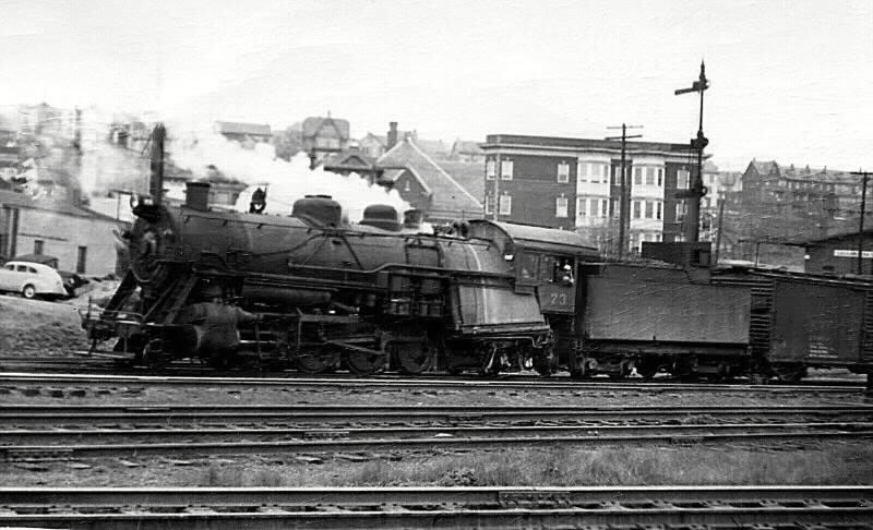 Photo #079: West bound freight about to cross into Easton, PA. Large building behind coal tender is at the corner of South Main & Hudson. Building to the right behind box car is DL&W freight station on Main Street. Automobile is parked on Market Street.