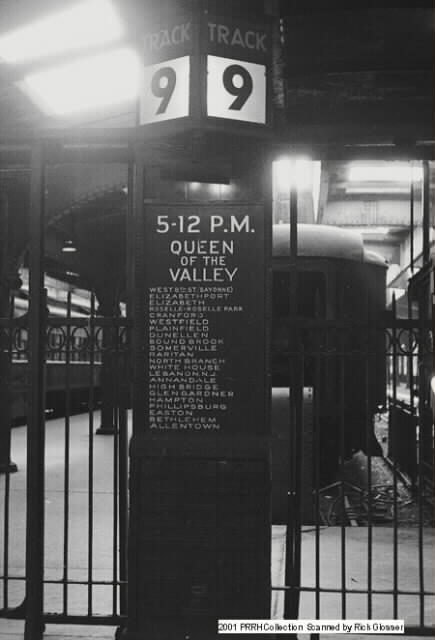 First up, inside the Bush trainshed, Track Gate 9 entry for the 5:12 P.M. "Queen of the Valley" as indicated by the route sign, listing the suburbia towns on a commuter route that would not survive the spring timetable change of 1967.