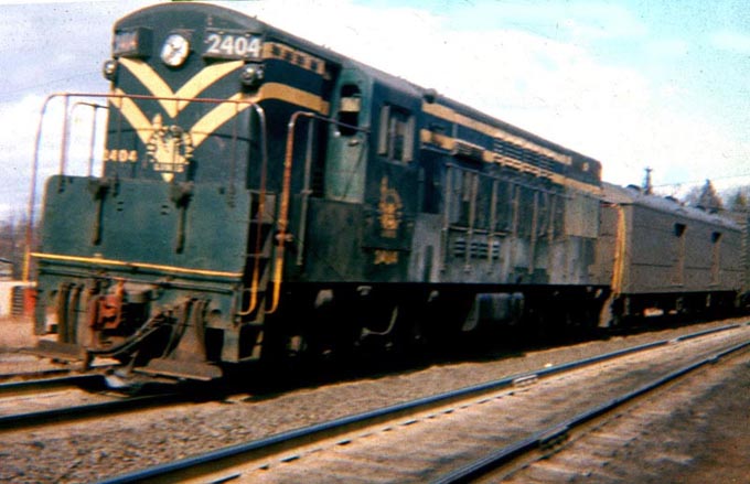 Photo #015: Photo of a westbound CNJ passenger train passing through Hampton, NJ pulled by Trainmaster 2404. Note the track just under the pilot on the left of the engine. This is the interchange track with the DL&W. Also on the left of the engine, you can see a box car spotted in Grief Brothers barrel factory.