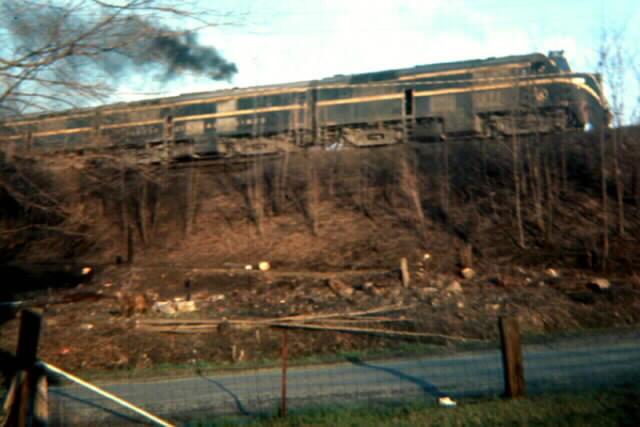 Photo #016: A westbound A-B-A set of Baldwins passing Railroad Avenue in Hampton, NJ. The road leading up to the station can be seen going up the embankment.