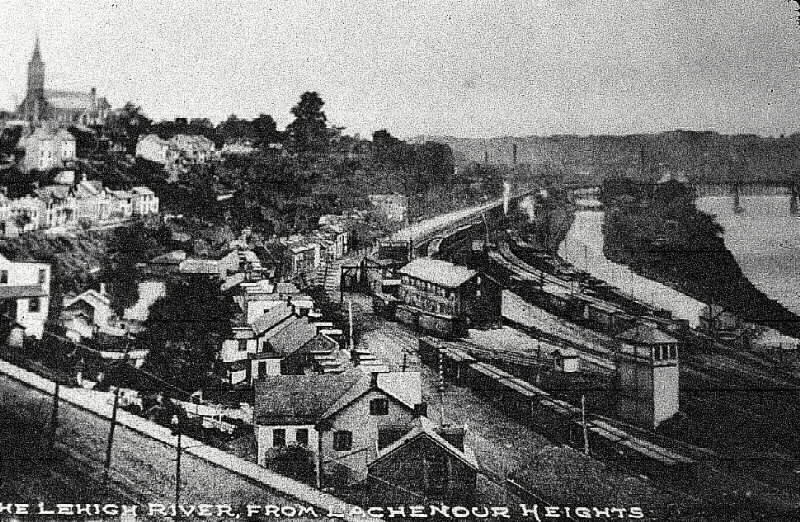Photo #3: We see the first Lehigh Valley tower at Easton and the E&N Bridge in the background. The smoke from 3 locomotives working can be seen. This photo was taken about 1905.