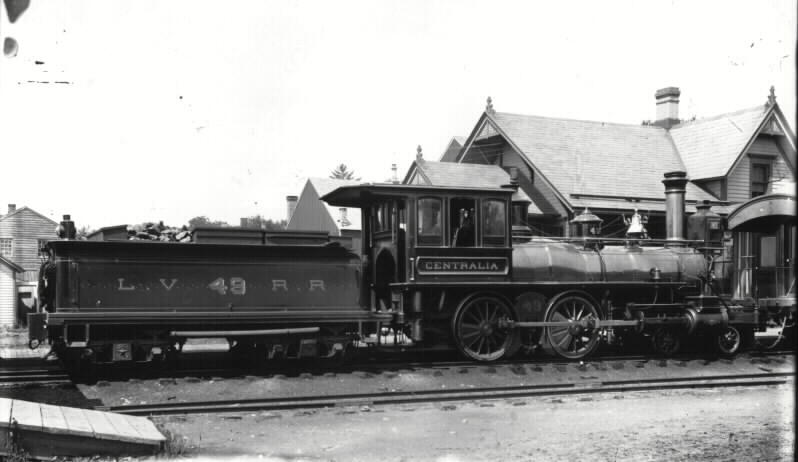 Photo #49: This photo shows LVRR 49 named “Centralia”. It was built in 1881 of the same class as LVRR 14 and my notes show it working the Clinton, Pittstown and Flemington Branches in the 1880s and early 1890s. A note about Centralia is that it's a town in Pennsylvania that had the mine fire and they moved people out of the town. The fire is still burning today.
