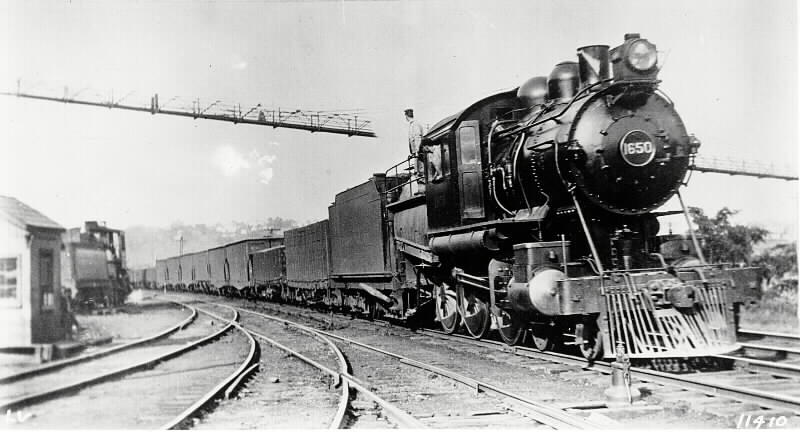 Photo #61: Here we see the 1650 on the main at South Easton Shops. The two men are looking back over the train but it looks like they are looking at the woman on the footbridge. This was one of two footbridges that crossed the Lehigh River here. The South Easton station was in the base of the tower for one bridge. I was told if you crossed the bridge with any wind it made you think about putting up the $.05 for the trolley for the trip the long way around. At times the wind was so bad, men going to work at the Shop that did not put the money up for the trolley ride came across the bridge on all fours.