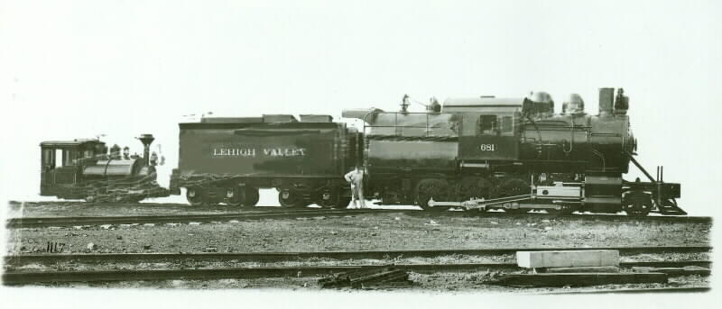 Photo #95: In 1899 the Lehigh Valley had the biggest locomotives in the world. This did not last long, within a year the IC got the rights of having the biggest locomotive. LVRR never had the biggest locomotive after this. This Baldwin photo was taken of LVRR 681 with a small tank engine, too big and too little. The 681 became 1305 then 954.