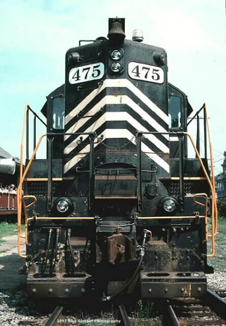 Photo 19: Front view of Winchester & Western RR GP9 #475 at Union Square, Phillipsburg, NJ on August 15, 1997. The 1750 hp unit was leased to the BDRV for additional power on the "Dirt Train" that BDRV operated from a local quarry in Carpentersville to Conrail's Hudson Yard along the Bel-Del line.