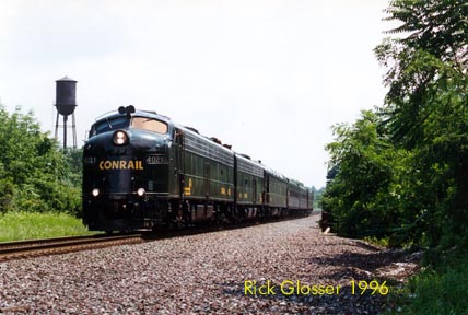 CR E8A 4020. Photo of Conrail's OCS-101 on July 26, 1996 at Green's Bridge, Phillipsburg, NJ. The westbound special is being powered by E8A 4020 and 4021. The 4020 will become NS 100, 4021 will become CSX 9998, and 4022 will become CSX 9999.