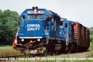 CR SD40-2 6398 from July 11, 1996 dressed in new "Q" paint and receiving new ditch lights.