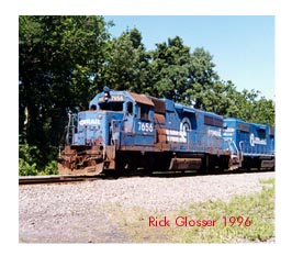 CR GP38AC 7656 ex-Lehigh Valley 310. This is one of the four (7656-7659) Conrail has classified as GP38s, but are in fact GP38ACs. Note the Valley's Cornell Red bleeding through the Conrail Blue. Photo was taken July 23, 1996 at Green's Bridge, Phillipsburg, NJ.