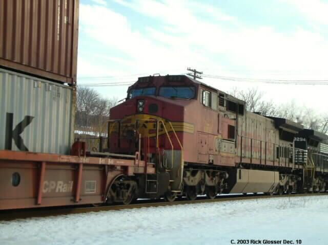 EB intermodal train NS 24V-10 has a very dirty BNSF C40-8W #823 still wearing Santa Fe "Warbonnet" paint scheme trailing behind an NS D9 #9294.