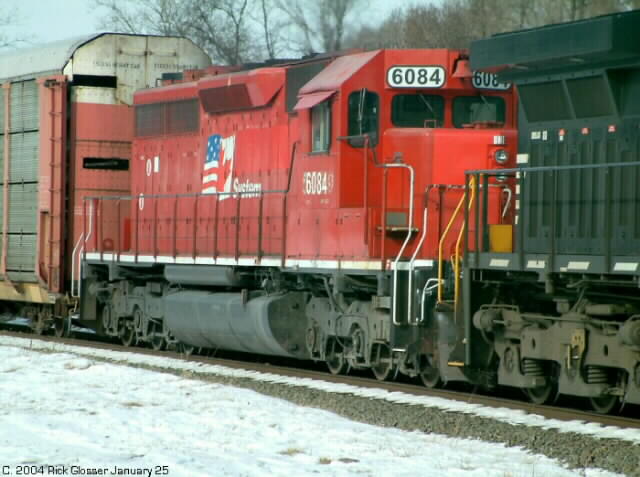 This morning @ 1031 hrs., EB Autorack 18N-24 led by NS D9 #9479 and trailing locomotive Dakota, Minnesota and Eastern SD40 #6084. The locomotive was still in ex- CP "Duel Flag" paint scheme. Old CP # was 55?? which was partially visible behind the new number.