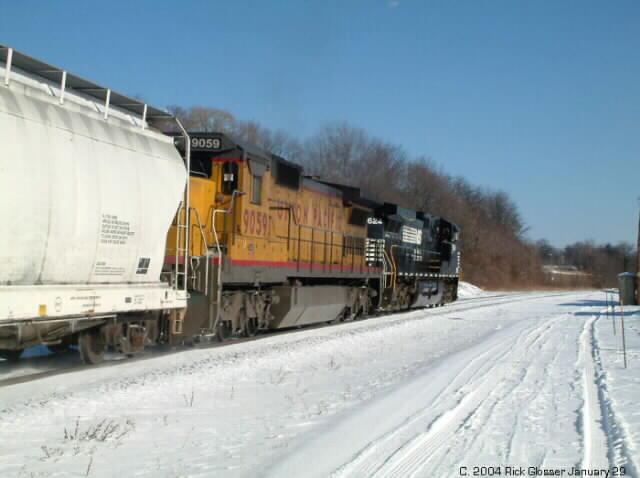 EB 42A-29 @ 1419 hrs. led by NS D9 #9624 and a very dirty Union Pacific D8-40C #9059.