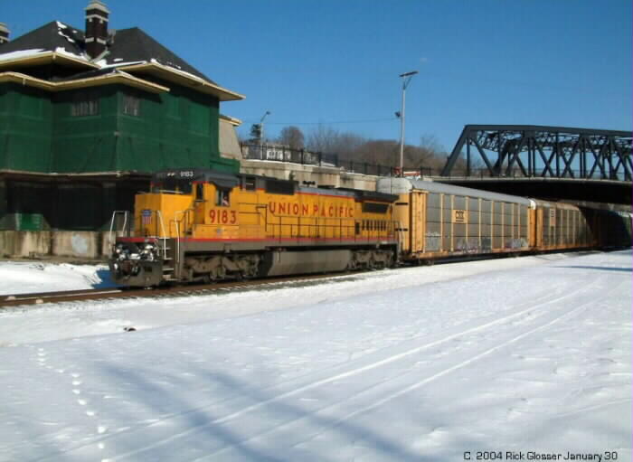 This afternoon I got to the PRRH site to see WB Autorack train 11J stopped and it's power was in front of the former CNJ tower. Coming over the South Main Street "Black Bridge" I could see that the 11J had one locomotive.... C40-8 Union Pacific #9183. I parked on Market Street and went down to the Lehigh line. The 11J, a low-priority train, was waiting for the Washington job H65 to come over the CNJ bridge for the Washington Secondary.