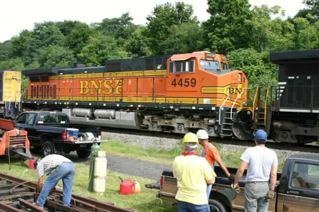 BNSF 4459 in Heritage II paint rolls eastbound during the PRRH work party Saturday.