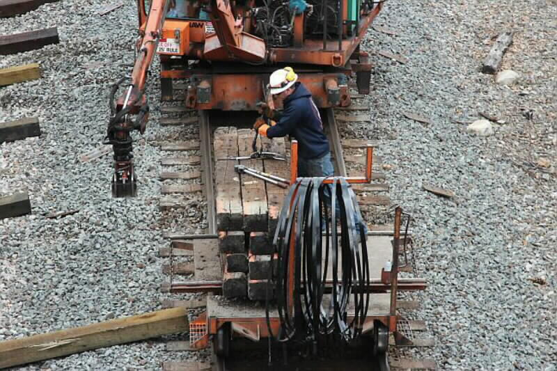 Photo 9: Next two machines pick up the bad ties and puts them on a wagon. When platform is filled, worker bails the bundle which platform lifts and slides off. - Rick Glosser -