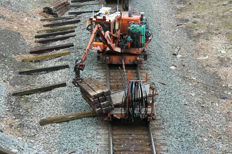 Photo 10: Next two machines pick up the bad ties and puts them on a wagon. When platform is filled, worker bails the bundle which platform lifts and slides off. - Rick Glosser -