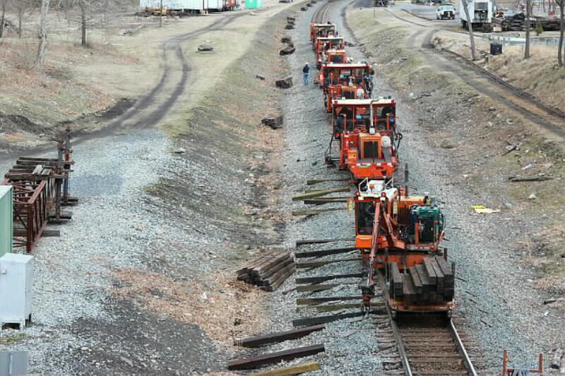Photo 11: Next two machines pick up the bad ties and puts them on a wagon. When platform is filled, worker bails the bundle which platform lifts and slides off. - Rick Glosser -