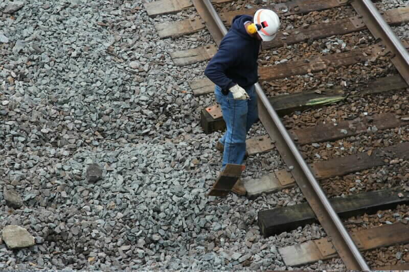 Photo 15: Sweeper brushes off ballast as workers follow using hooks to place tie plates on the new ties. - Rick Glosser -