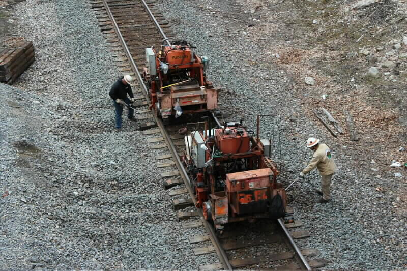Photo 16: Next machines lift rail and tie plates are slid back under rail. Note workers stick is remote to raise rail, left and right side. - Rick Glosser -