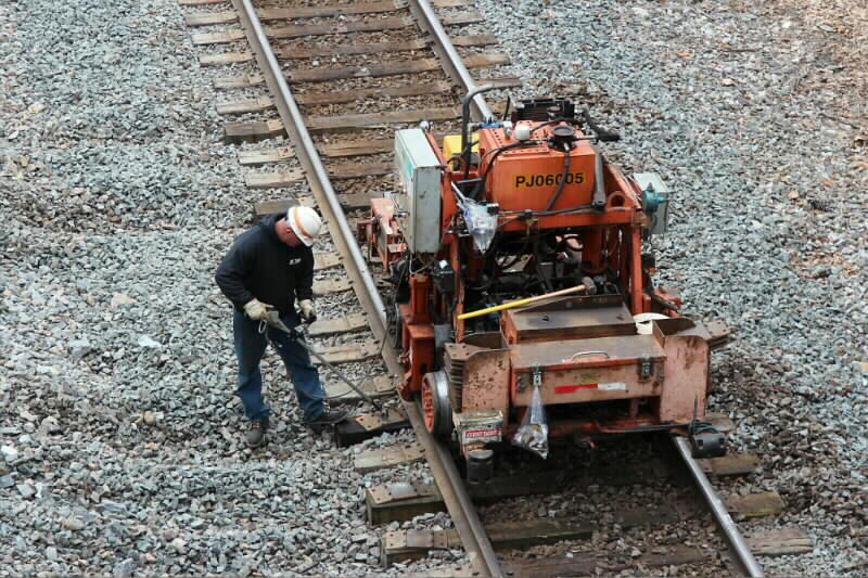 Photo 17: Next machines lift rail and tie plates are slid back under rail. Note workers stick is remote to raise rail, left and right side. - Rick Glosser -