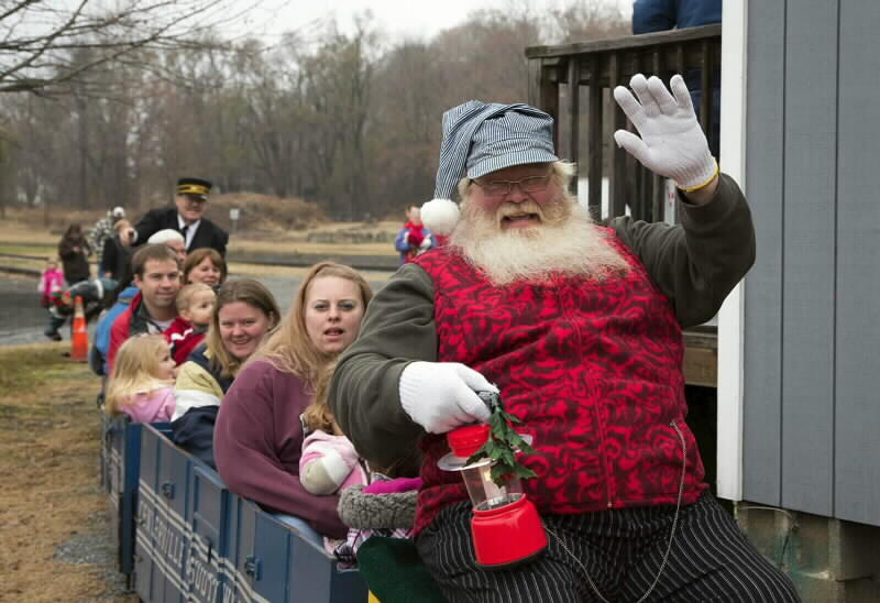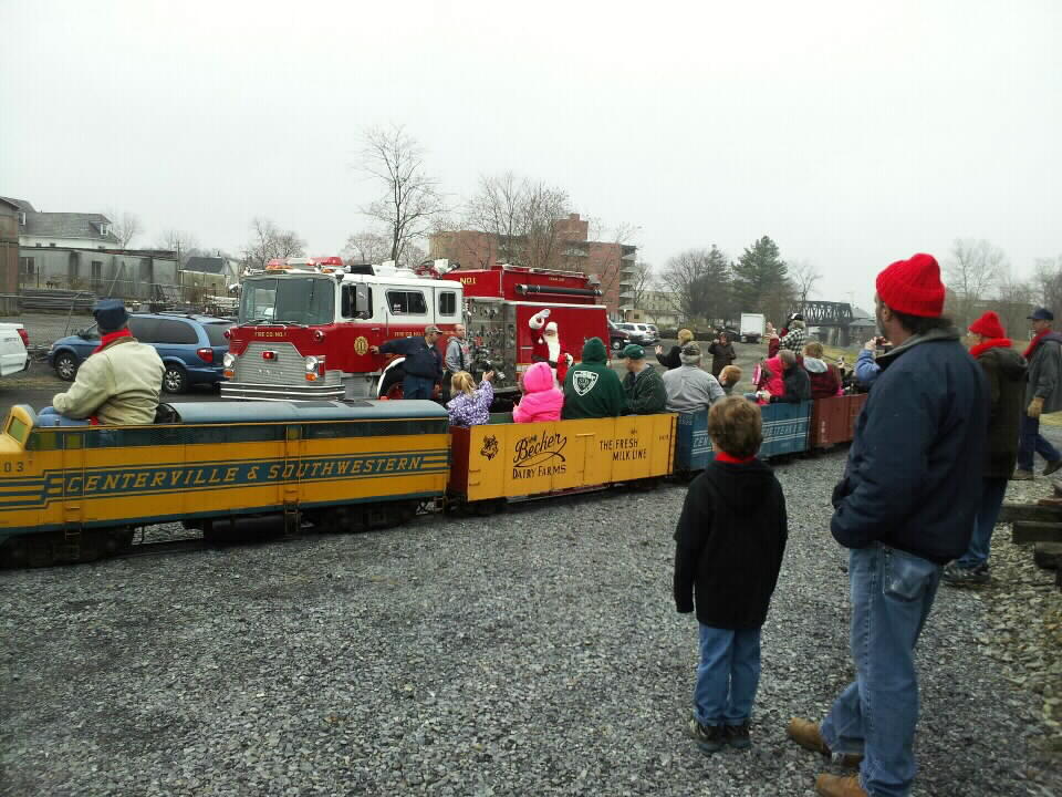 Santa waves as he enjoys a ride on the Centerville & Southwestern Railroad. Santa wore his extra special honorary C&S engineer's uniform.